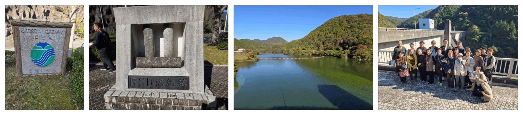 ・島地川ダムシンボル ・RCD記念碑 ・髙瀬湖 ・2025年11月、商業部会の視察研修で島地川ダムを訪問。春は藤棚が彩り、絶好のフォトスポットに。