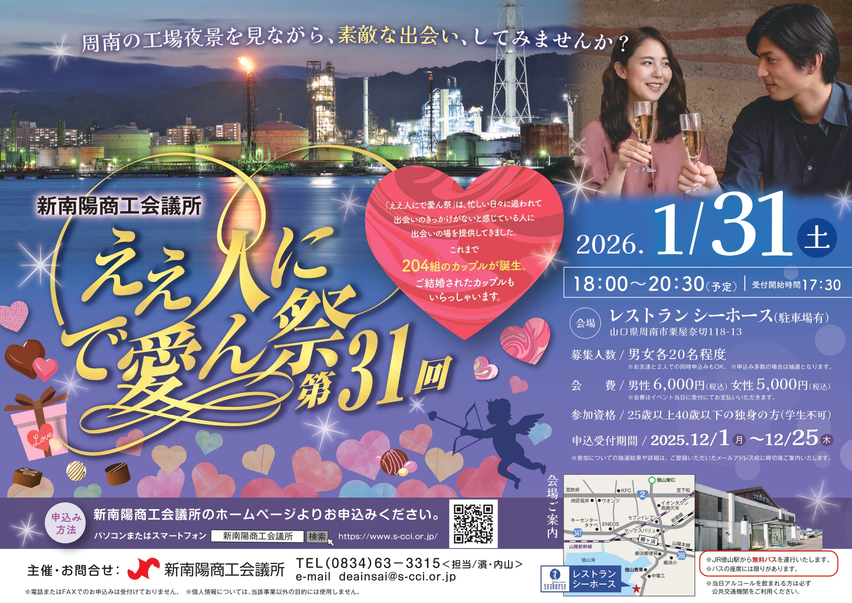 「ええ人にで愛ん祭」は、忙しい日々に追われて、出会いのきっかけがないと感じている人に、出会いの場を提供してきました。今回で31回目を迎えるこの会からは、これまでに204組のカップルが誕生し、中にはご結婚されたカップルもあります。貴方もこの機会に素敵な出会いを探してみませんか?