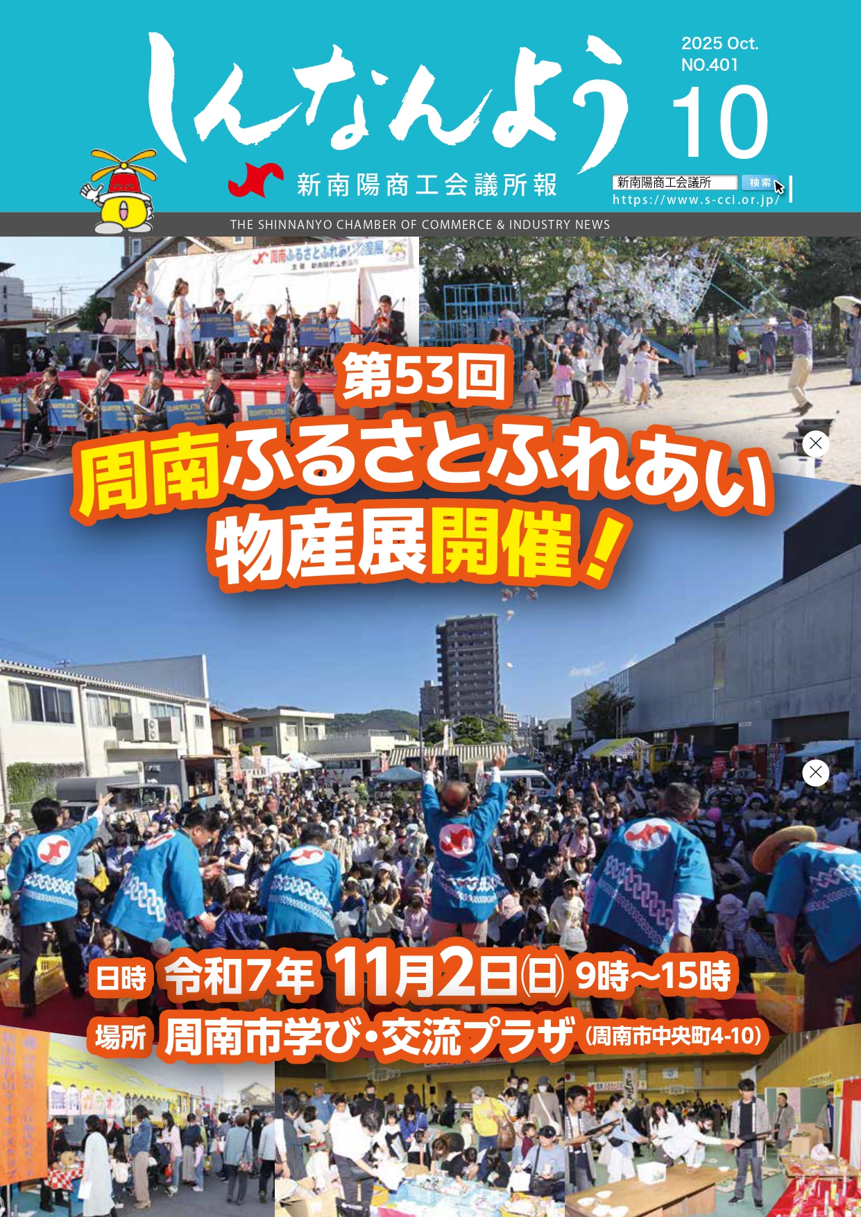 新南陽商工会議所報2025.10No401 2025年10月1日 新南陽商工会議所会報, 新着情報 2025年10月号 地域密着!新南陽地域の事業者様のお力になります! 新南陽商工会議所には、経営者や個人事業主の方が安心して利用できるサービスが多くあります。個人事業主の方でも入会できます。まずはお気軽にお問い合わせください。 入会についてはこちら 新南陽商工会議所の職員が、新南陽地域の皆様のお力になります。 中小企業支援に関することはお気軽にお問い合わせください! 0834-63-3315 平日 9:00 - 17:30土曜 9:00 - 12:00(第2・4土は休み) お問い合わせ・資料請求 メールは24時間受け付けております。 ソーシャルボタン Tweet こちらの記事も読まれています。「令和6年能登半島地震」に対する災害義援金のご協力方お願いについて 「令和6年能登半島地震」に対する災害義援金のご協力方お願いについて 本募金活動にご協力いただけます場合は、下記資料をご確認いただき2月21日(水)までに当商工会議所宛にお申込・ご送金くださいますようお願い致します。 「令和6年能登半島地震」に対する災害義援金のご協力方お願いについて 「令和6年能登半島地震」義援金申受要領 令和6年能登半島地震振込連絡票 […]【開催日:10/16】第67回秋の周南パラボラ会 周南パラボラ会 「周南パラボラ会」は ・各会の「人を知る」ことを目的としています。 ・誰とでも気軽に人脈作りができる「場」を提供します。 ・商工会議所会員事業所であれば何人でも参加することができます。 ・かしこまったルールはありません。 日程 令和2年10月16日(金) 時間 18:00~19:00 (受付17:30~) 今回は […]新南陽商工会議所報2022.12No367 2022年12月号 新南陽商工会議所報2020.11 No342 2020年11月地域版人的資 本経営コンソーシアム(福岡会場)開催のお知らせ 地域版人的資 […] 前後の記事 前の記事 【加盟店募集】(新南陽商工会議所会員限定)プレミアム付商品券「ムーンフェスタしんなんよう応援チケット」