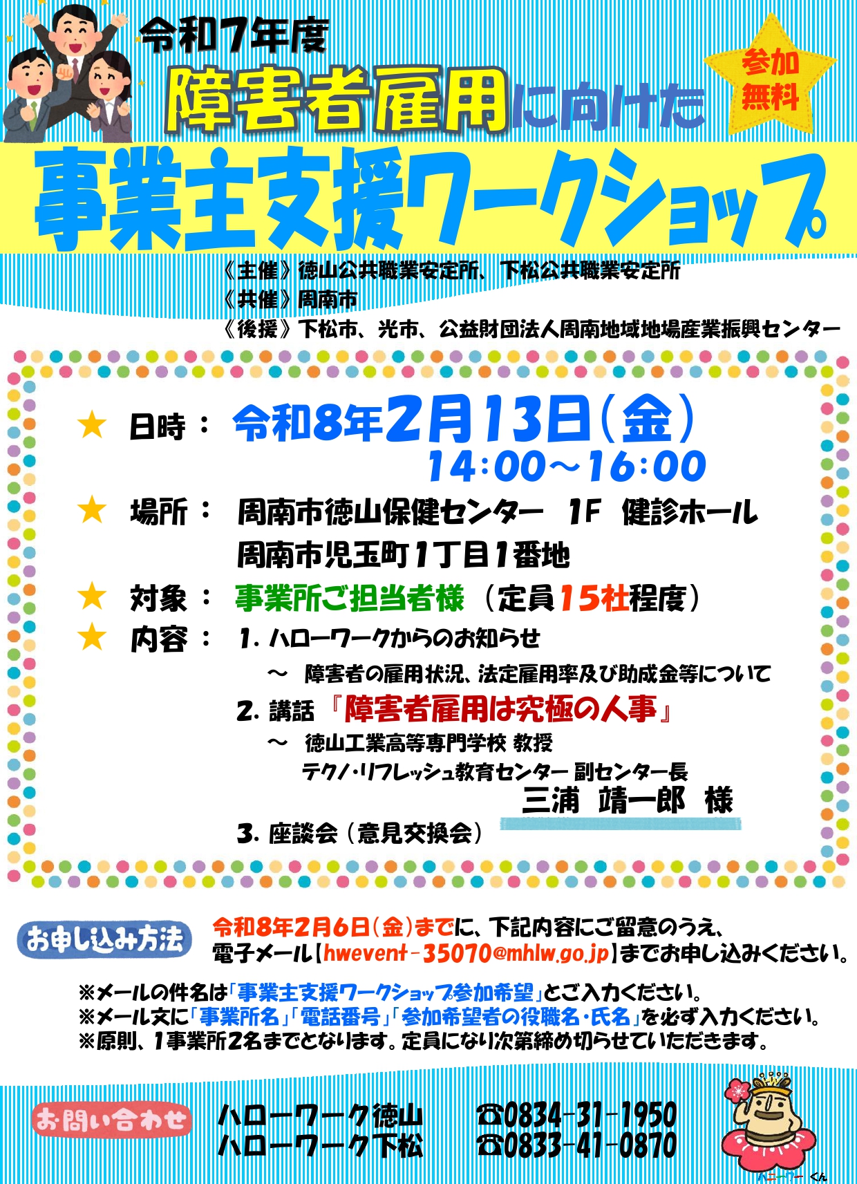 周南市からのお知らせです。市では、徳山・下松公共職業安定所と共催で、障害者雇用に向けた事業主支援ワークショップを開催します。