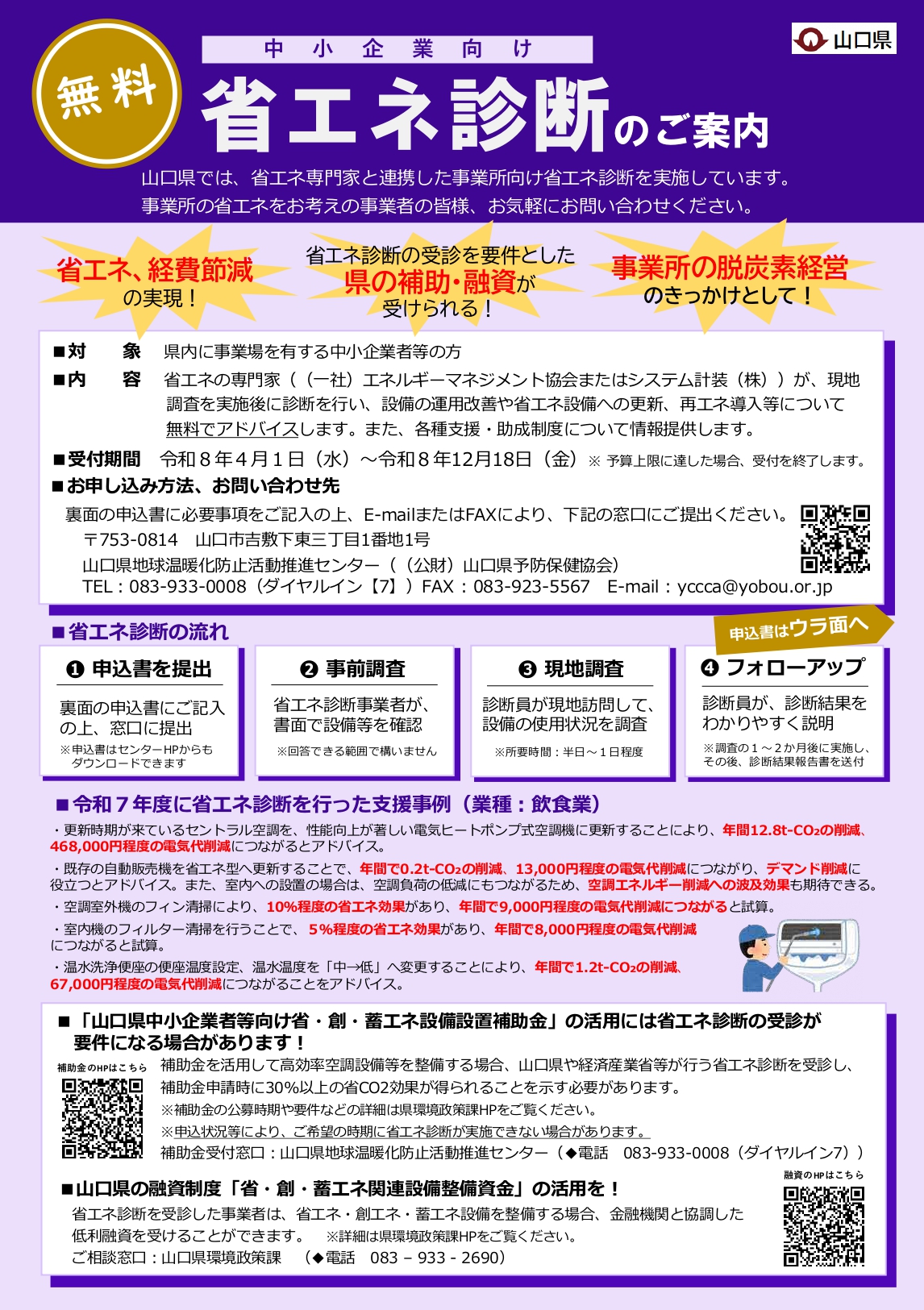 「山口県中小企業者等向け省・創・蓄エネ設備設置補助金」を活用して高効率空調設備等の設置を行う場合や、融資制度「山口県省・創・蓄エネ関連設備整備資金」を活用する場合は、省エネ診断の受診が対象要件の一つになります。